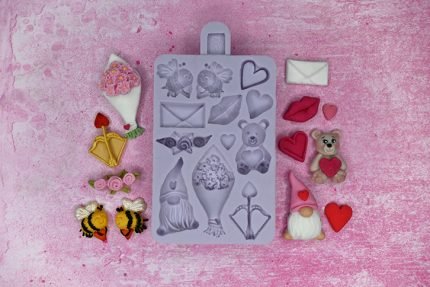 Miniature Valentines Silicone Mould - Create a mini celebration of love with our Miniature Valentines Silicone Mould. Whether you're surprising your special someone or sharing treats with friends and family, these tiny delights will add a sweet touch to your Valentine's Day festivities. Designs include bouquet, gonk, bees, envelope, roses, three hearts, teddy, cupid's bow, and lips.Order now to start your romantic baking adventure and spread love with every treat!