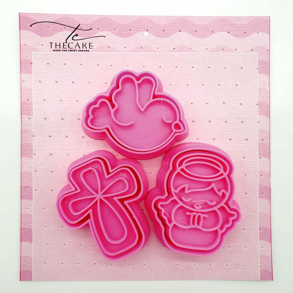 3D Baptism Cutter and Stamp Set The Baptism Cutter and Stamp Set from TheCake Cutters is an excellent choice to elevate your party and event recipes and orders, ensuring they are both professional and beautifully presented. These sets will undoubtedly make a positive impression on your clients or guests Ideal for cutting dough, cookies, fondant, sugar paste, and biscuits, as well as for stamping brigadeiros, gourmet sweets, chocolates, truffles, cake toppers, and more. Featuring beautiful religious-themed designs, they allow your creativity to enhance every detail. Includes 3 pieces of religious-themed images